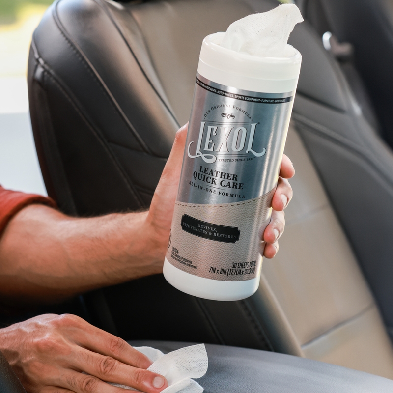 LEXOL offers a variety of products that are a terrific way to quickly clean the leather or vinyl surfaces in your car— plus, they can be easily stored in your glove box so you are prepared at a moment’s notice! LEXOL Leather Quick Care, which cleans and conditions leather in one easy step, is available in the convenient yet durable Canister Wipes.