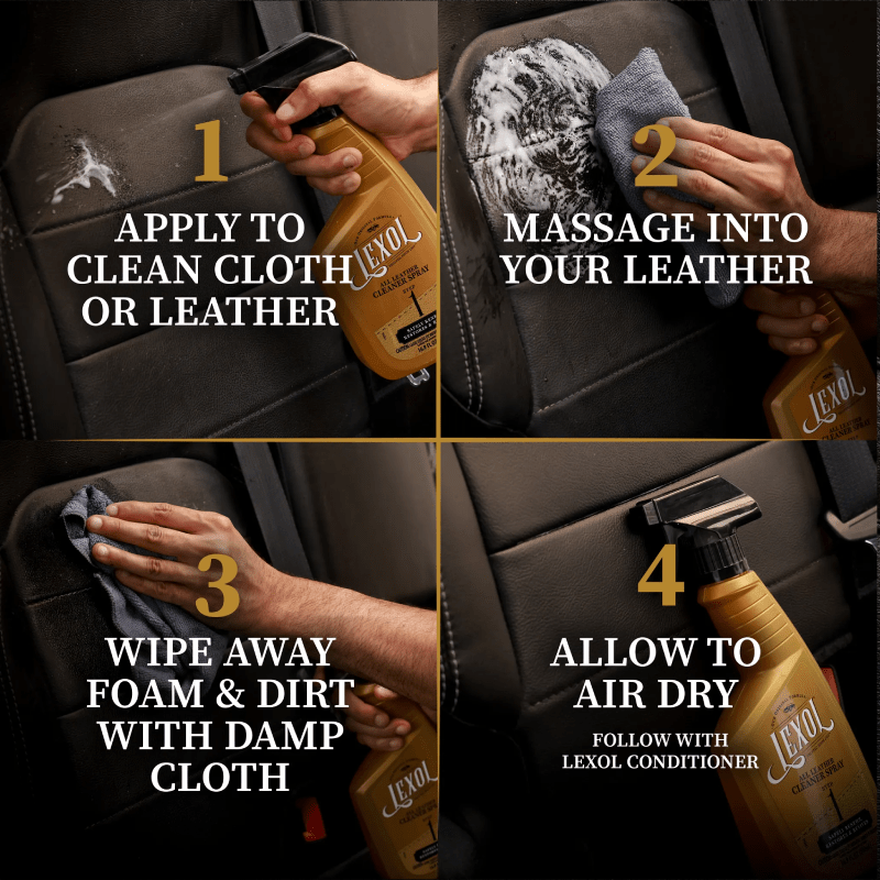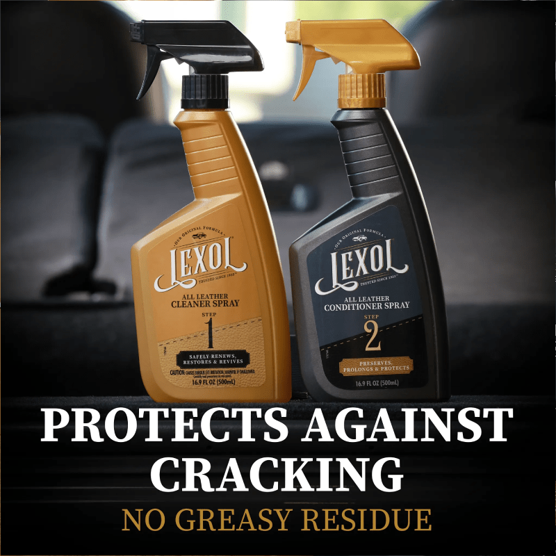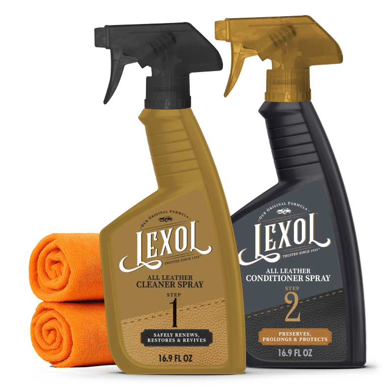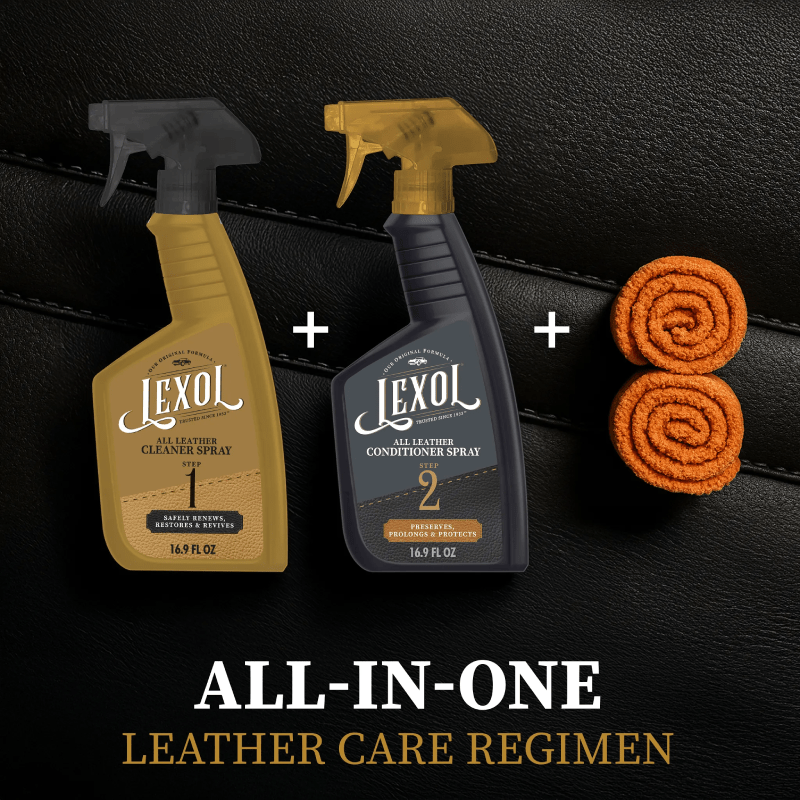 The elements are not kind to your leather investments. Fortunately, you can protect them with the 2-step Lexol Leather Care Regimen Kit. With one of the supplied premium microfiber towels, massage Lexol Leather Deep Cleaner into your leather and simply wipe dirt and oils away to restore a like-new appearance. Then, with the other microfiber towel, apply Lexol Leather Deep Conditioner—in minutes, your leather will absorb the fine oil droplets, nourishing and restoring flexibility to defend against cracking without leaving greasy residue. Treating every 6 months will extend the life of your finished leather investments: car seats, leather furniture, briefcase, satchel, shoes, jacket, and sports equipment. Protect the leather you love with the Lexol Leather Care Regimen Kit. Lexol, Trusted since 1933.