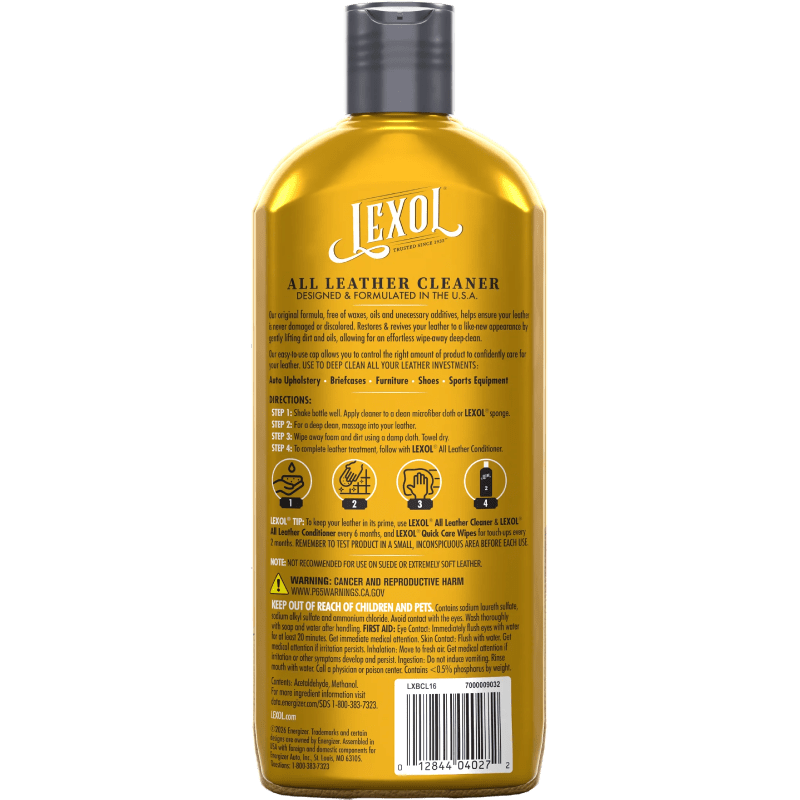 The pH-balanced formula matches the natural pH of leather, ensuring safe cleaning for both the leather surface and the stitching that holds it together. Its gentle foaming action loosens and lifts dirt, making it easy to wipe away without leaving any sticky residue. After cleaning, your leather is left healthy, supple, and ready to breathe—perfectly prepared for conditioning with LEXOL® All Leather Conditioner.